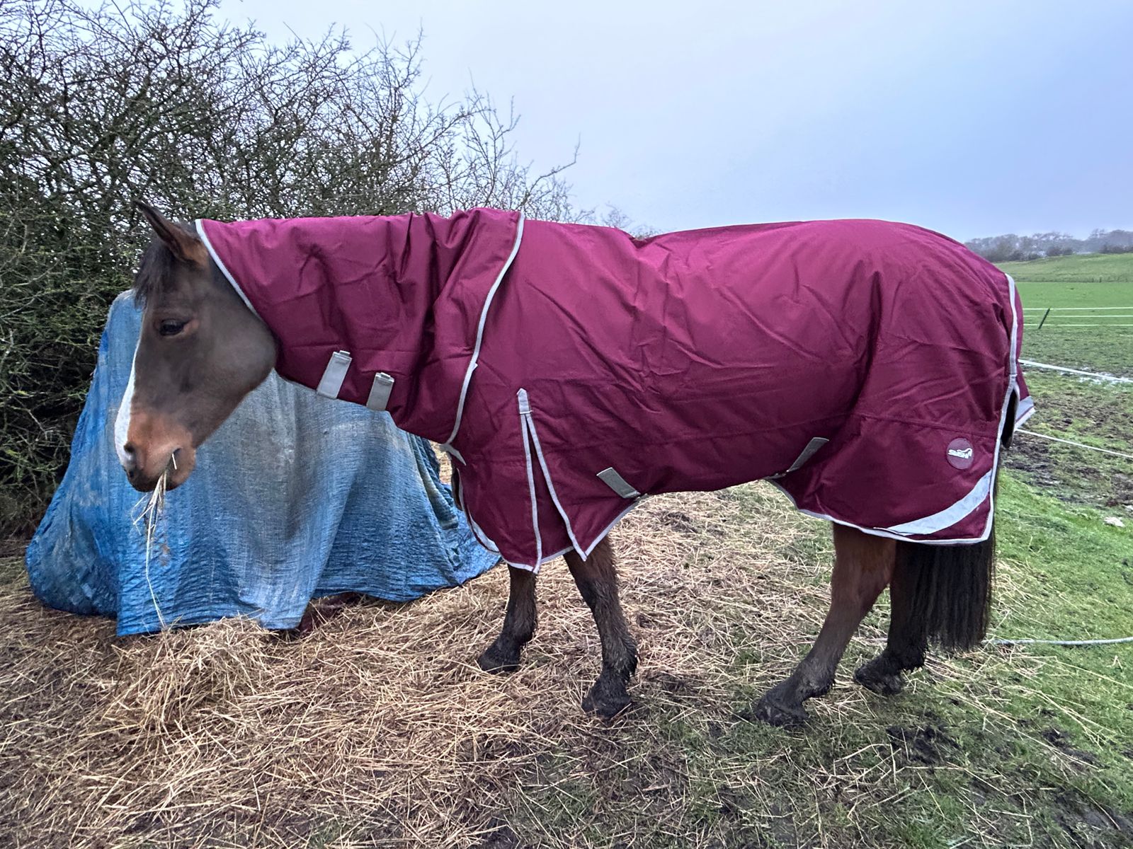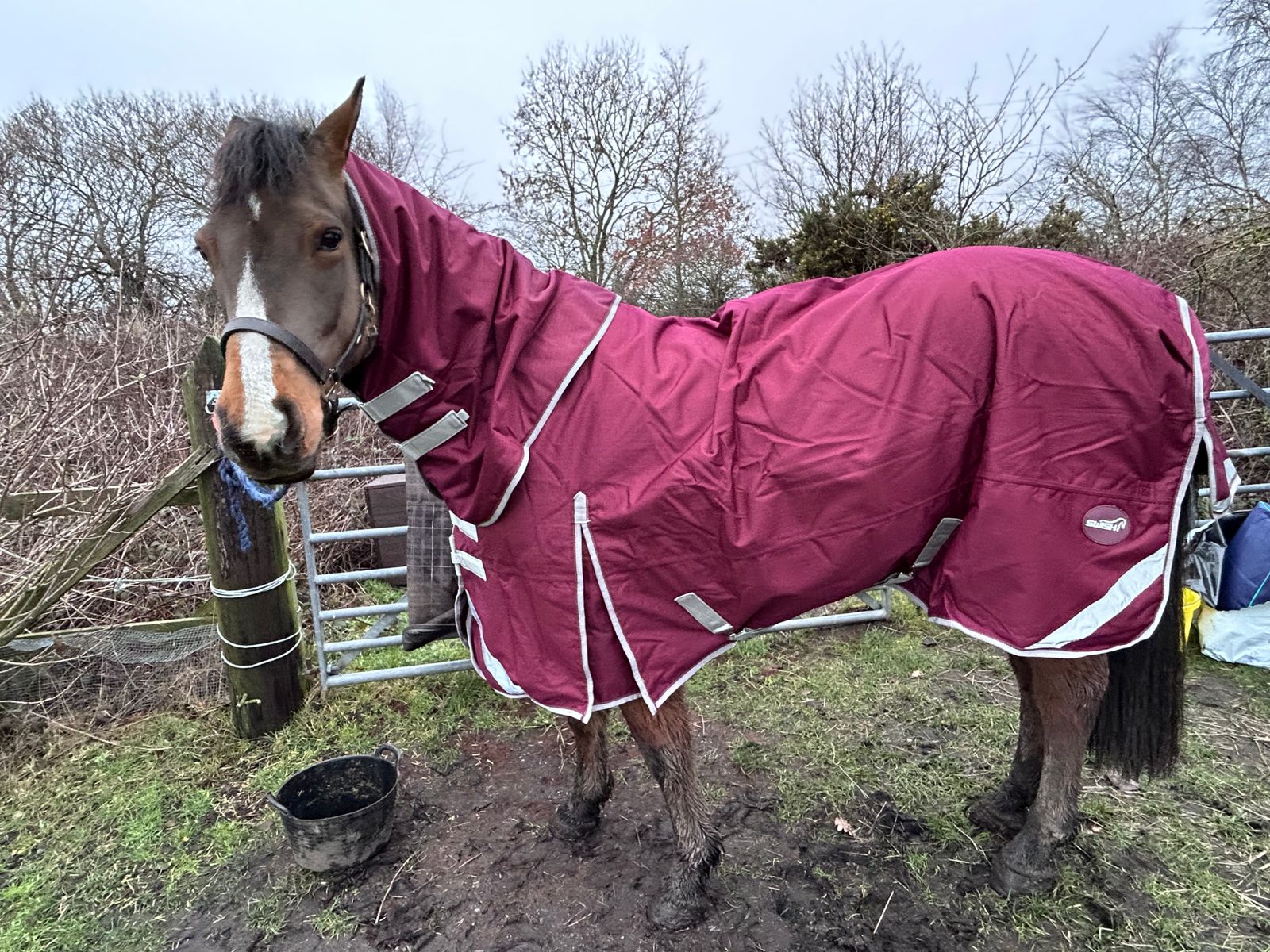 Velcro easy to attach, roomy enough so it isn't rubbing on pony's neck whist grazing and still cozy. I went for a large fit for my 15h 6'3 rug size connemara
